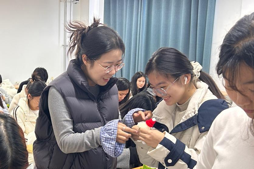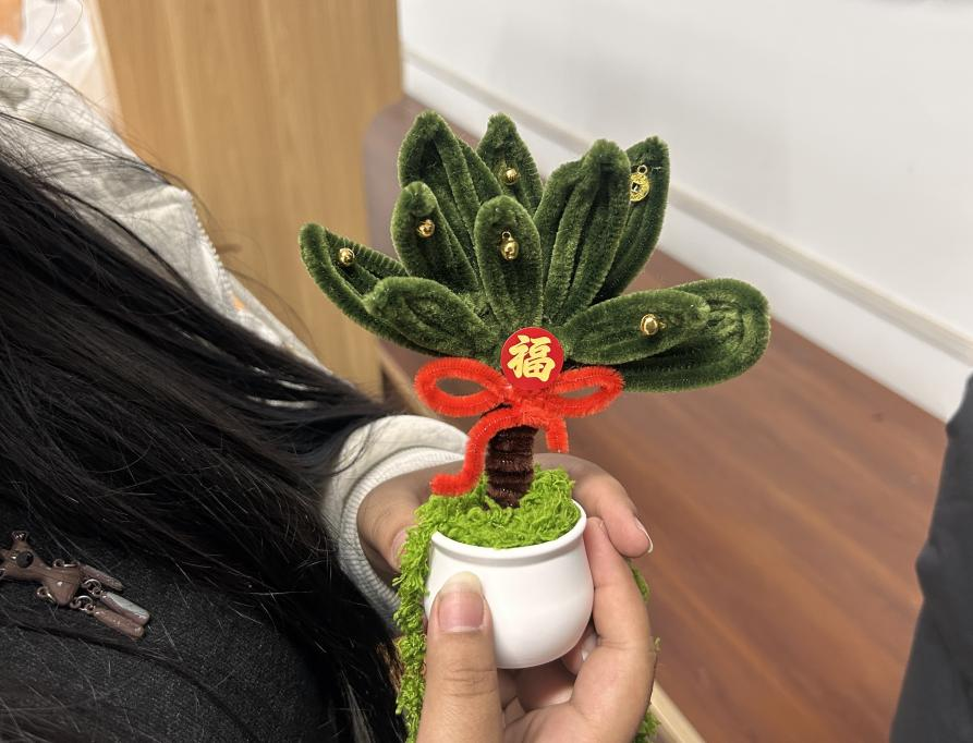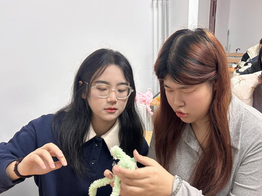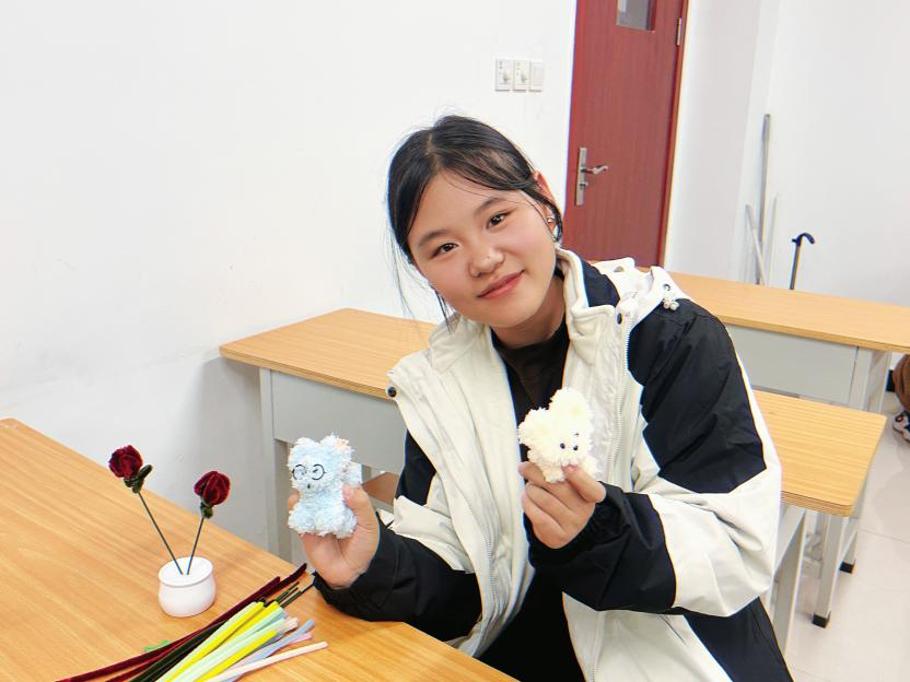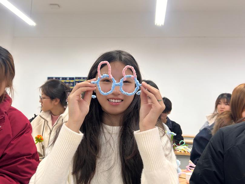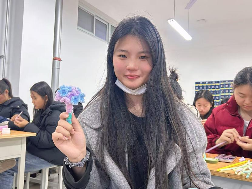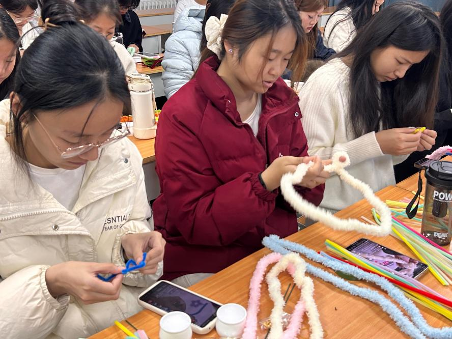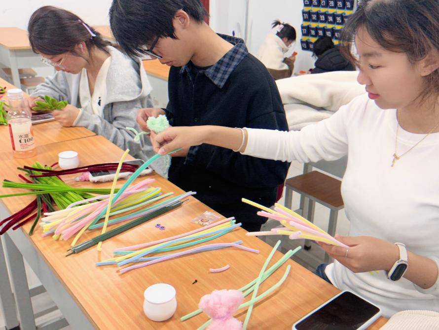 现场氛围轻松而专注,笑声与交流声交织成温暖的乐章。酒管2401心理委员李悦同学举起手中的扭扭棒小花朵,笑着说道:“原来专注做一件简单的事,能让心情这么放松!仿佛烦恼也随着扭扭棒的转动被‘扭’走了。”在手工的慢节奏中,同学们暂时远离电子屏幕与学业压力,重新感受指尖的温度与创造的喜悦。