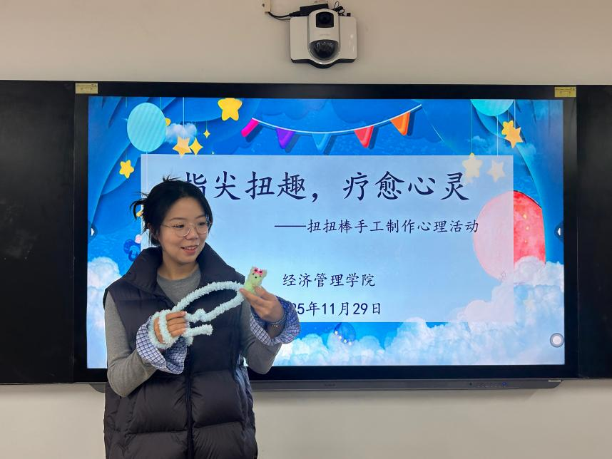 当指尖与色彩相遇,当创意与心灵相拥,一场关于治愈与发现的旅程悄然开启。11月29日,在经济管理学院E309教室里,洋溢着别样的温暖与欢笑。同学们放下课业的繁忙,拾起五彩的扭扭棒,用双手编织情感,以创意疗愈心灵,共同参与了一场名为“指尖扭绕,疗愈心灵”的扭扭棒DIY心理健康主题活动。