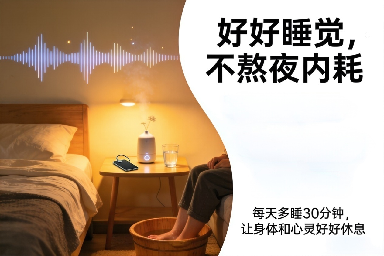 好好睡觉,不熬夜内耗:尽量不熬到凌晨,哪怕每天多睡30分钟,睡前放下手机,泡个脚、听首轻音乐,让身体和心灵都能好好休息;
