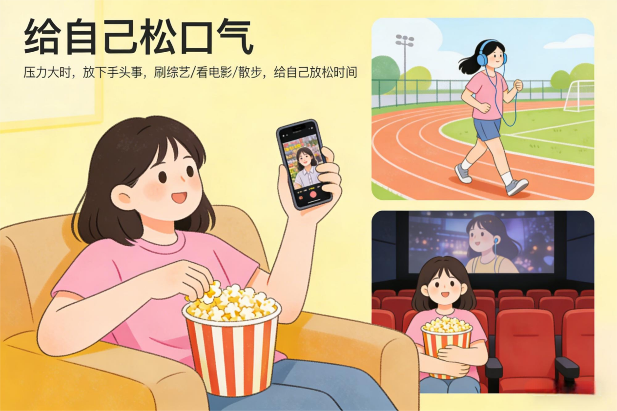 给自己“松口气”:觉得压力大的时候,放下手头的事情,刷一集搞笑综艺、看一部喜欢的电影,或者去操场散散步,给自己一点放松的时间;