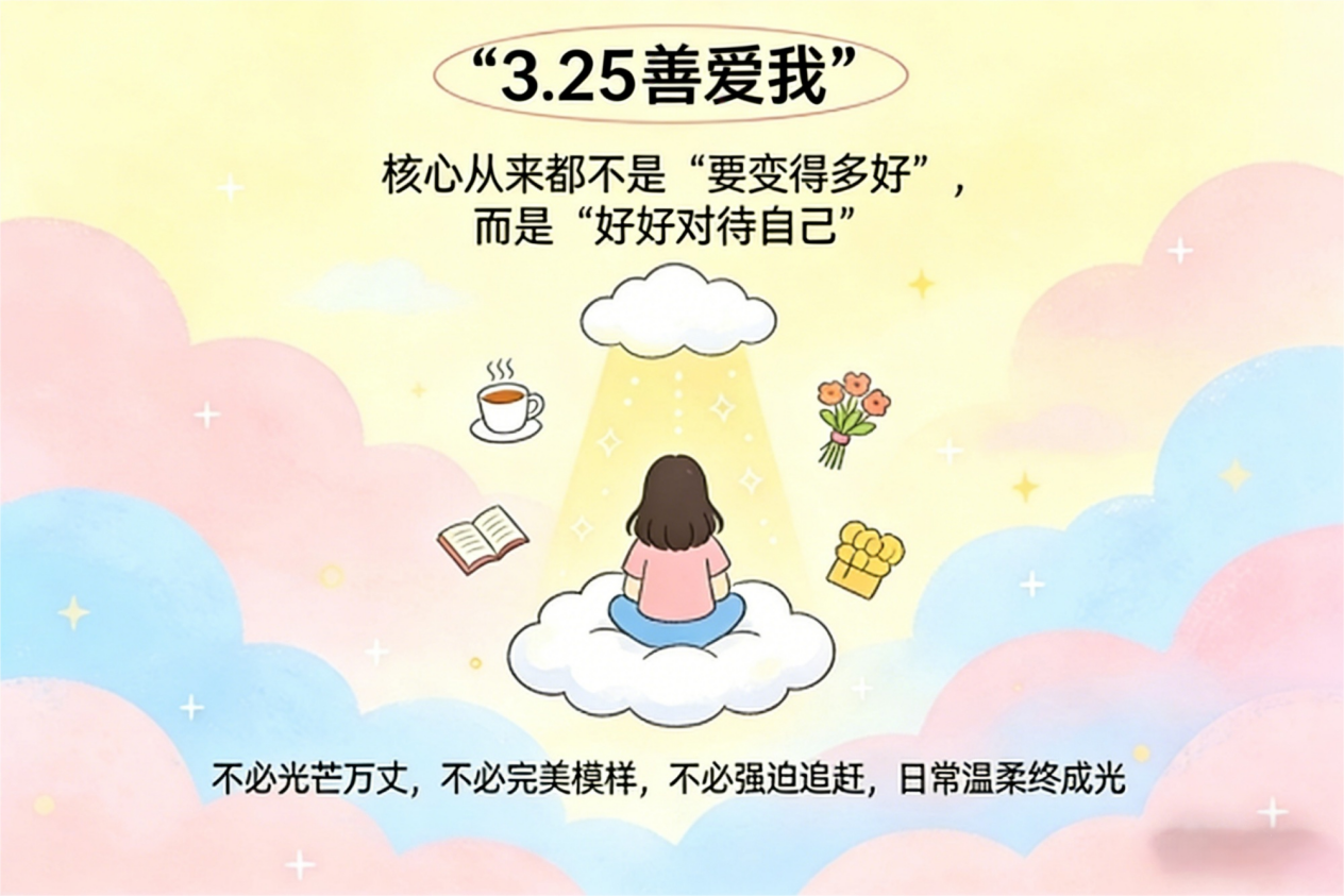 “3.25善爱我”,核心从来都不是“要变得多好”,而是“好好对待自己”。我们不必光芒万丈,不必成为别人眼中的完美模样,不必强迫自己跟上别人的脚步。那些看似微不足道的小事,那些我们日复一日坚持的温柔,终会汇聚成一束光,照亮我们的生活,驱散所有内耗,让我们活得轻松、自在、有力量!